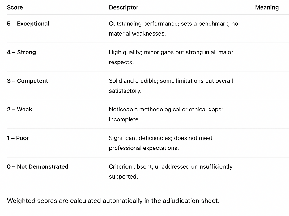 Each judge independently scores the submission against the six evaluation criteria using the 0–5 scale and weighting rubric.